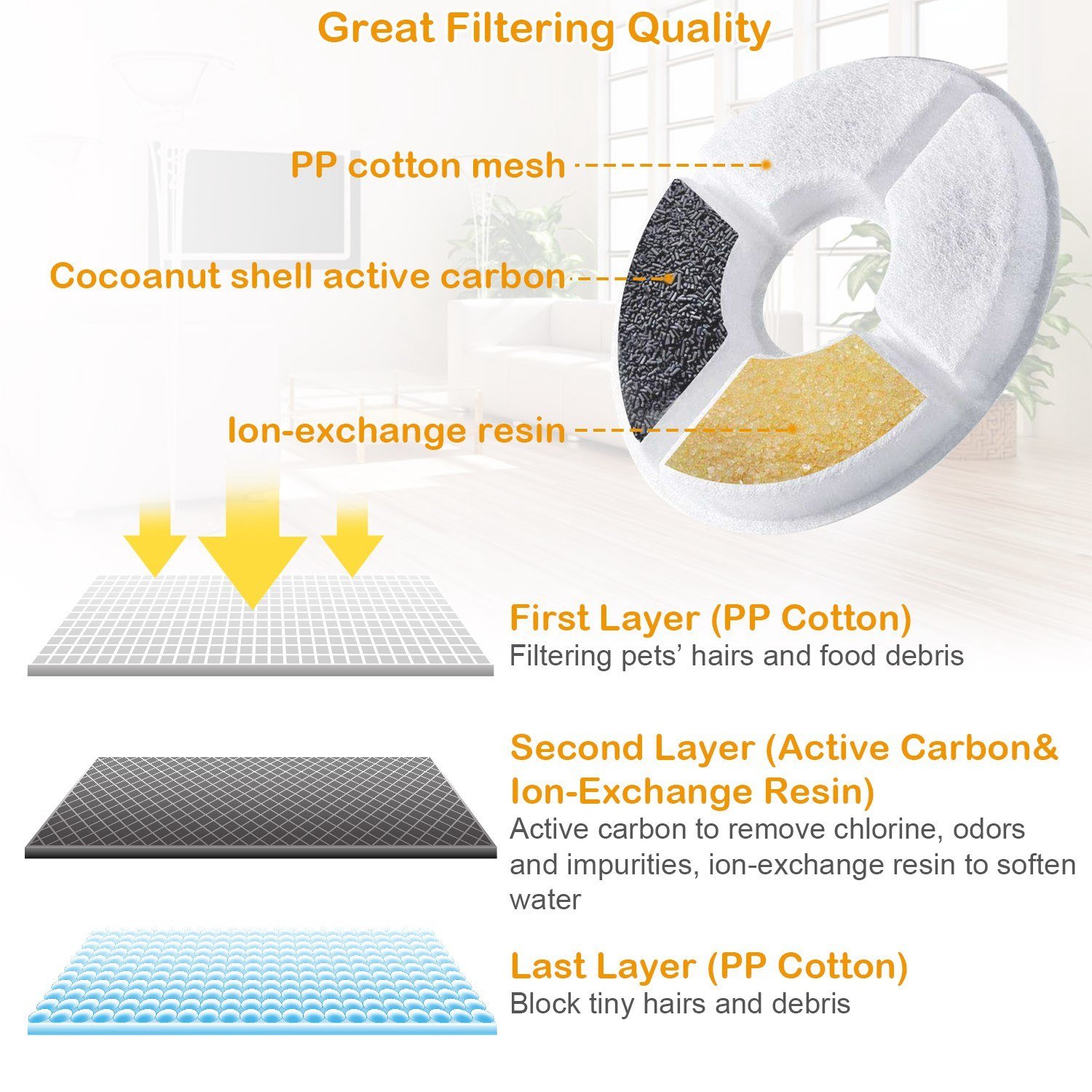 **REST ASSURED TO THE WATER QUALITY*:Owing a cocoanut shell active charcoal and ion-exchange resin filter to effectively remove the hair of you cat; bad odor; adverse chlorine and heavy metal contained in the water.