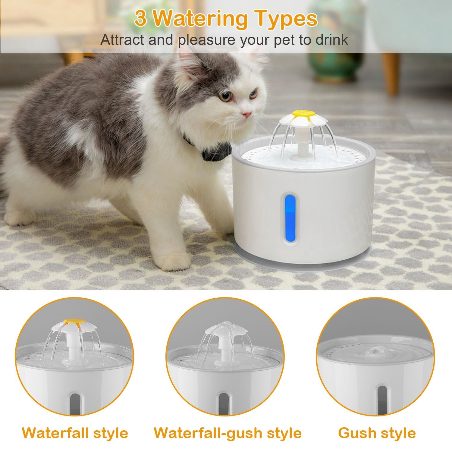 **3 WATERING TYPE TO PLEASURE YOUR PET*:Waterfall style-when you insert the entire daisy flower-shaped water column into the assembled fountain. Gush style-when you pull out the entire water column from the assembled fountain. Waterfall-gush style-when you remove the flower heat from the water column.