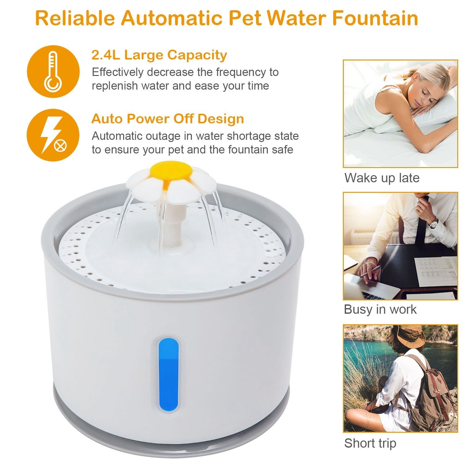**2.4L LARGE CAPACITY TO DRIVE AWAY YOUR ANXIOUS*:2.4L automatic water fountain can effectively decrease the frequency to replenish water and ease your time that means you can you don’t have to wake up to replenish water in fixed time and you don’t have to worry the water problem when you have a short trip. Besides; it is built-in a LED light and a visible window to see water level conveniently even in dark night and it designs an auto power off function in water shortage state to ensure your pet and the fountain safe.(Note:the LED light is always in blue color when the fountain works normally and will flash in red color in water shortage state.)