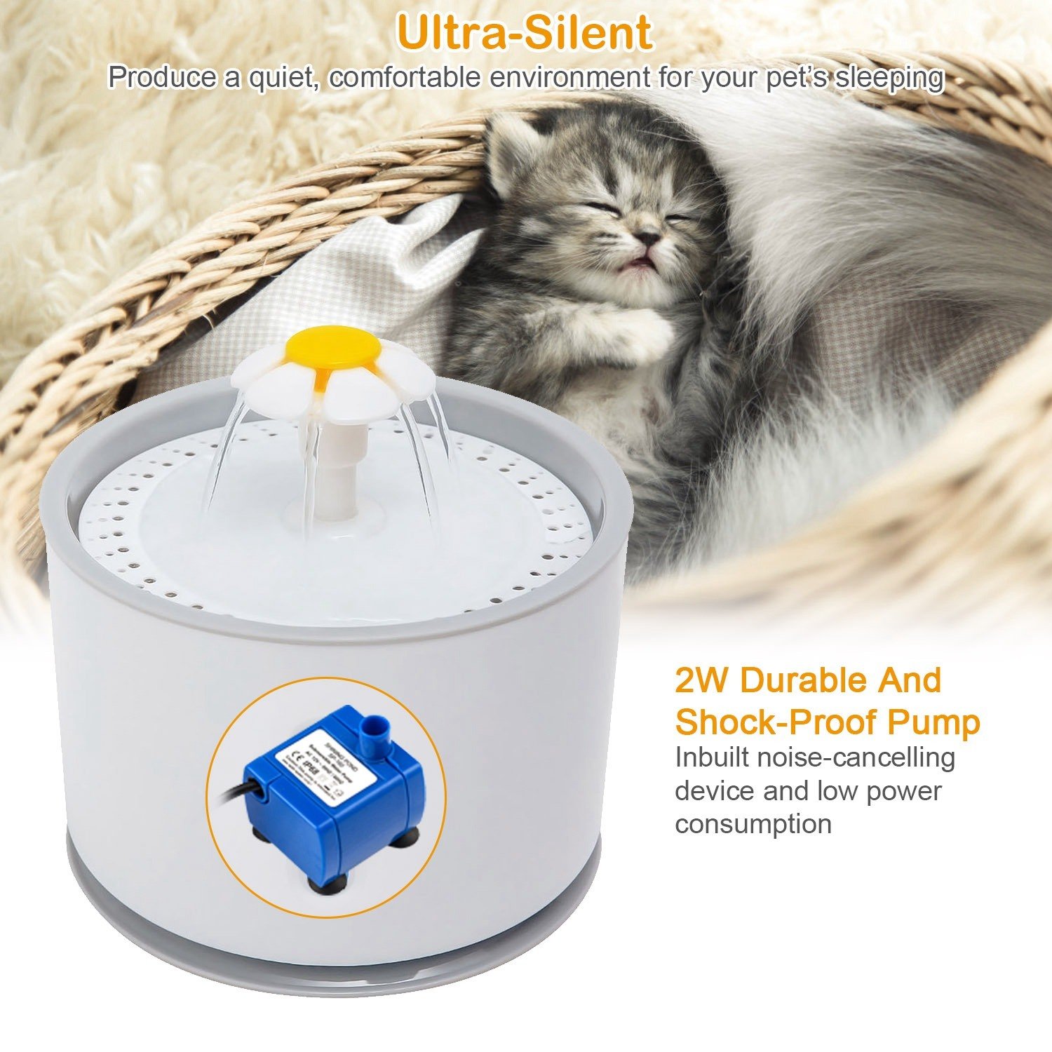 **ULTRA-SILENT AND ENERGY-SAVING*:The durable and shock-proof pump in our fountain is inbuilt noise-canceling device to provide a quiet; comfortable environment for your pet’s sleeping. Besides; its 2W low power consumption can greatly save energy and cost.