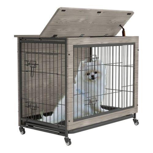 Style meets function with this versatile wooden indoor kennel that serves as a secure space for your pet as well as a practical piece of furniture that easily blends with your interior design. This heavy-duty dog crate is conveniently on rolling casters to be able to move to any room in the house. Dog cage three generously sized entry points including a wide double-door, single side-door, and horizontal lift-top provide easy accessibility. The pet crate two front-facing doors are equipped with premium latches to securely shut closed. Pet cage high-quality iron bars enclose the open-air design to allow for proper ventilation and 360* degree visibility. Give your pet a safe place to rest that doesn't obstruct your room decor thanks to this furniture-style dog pen!