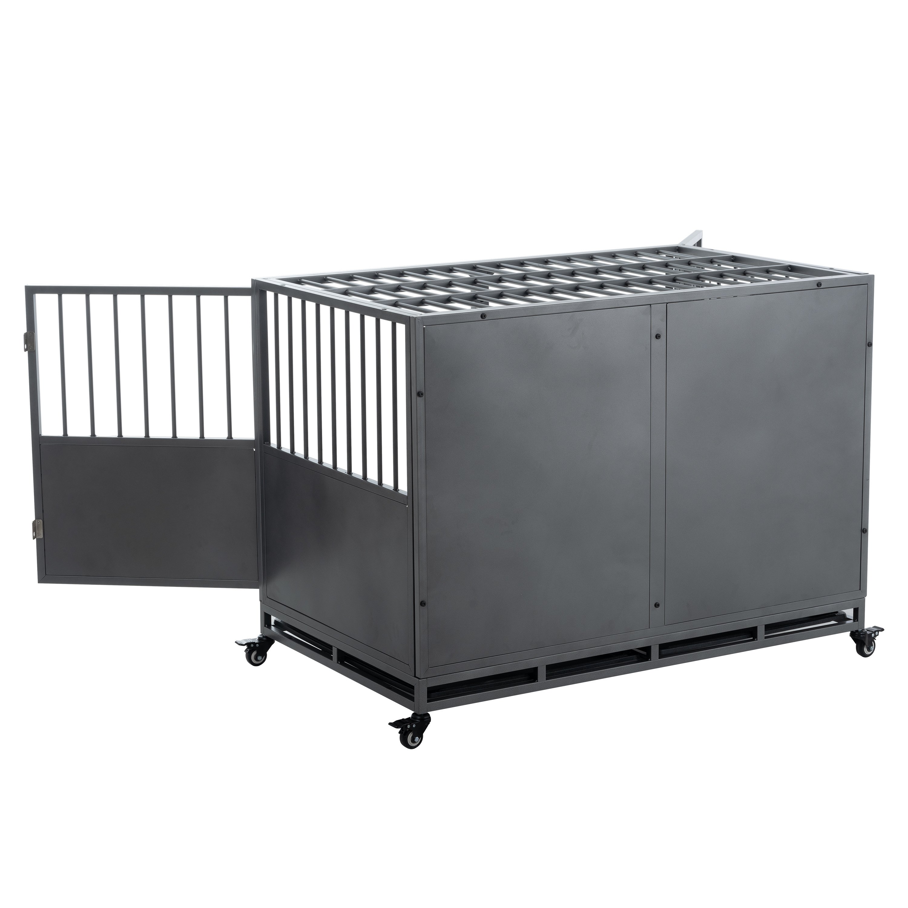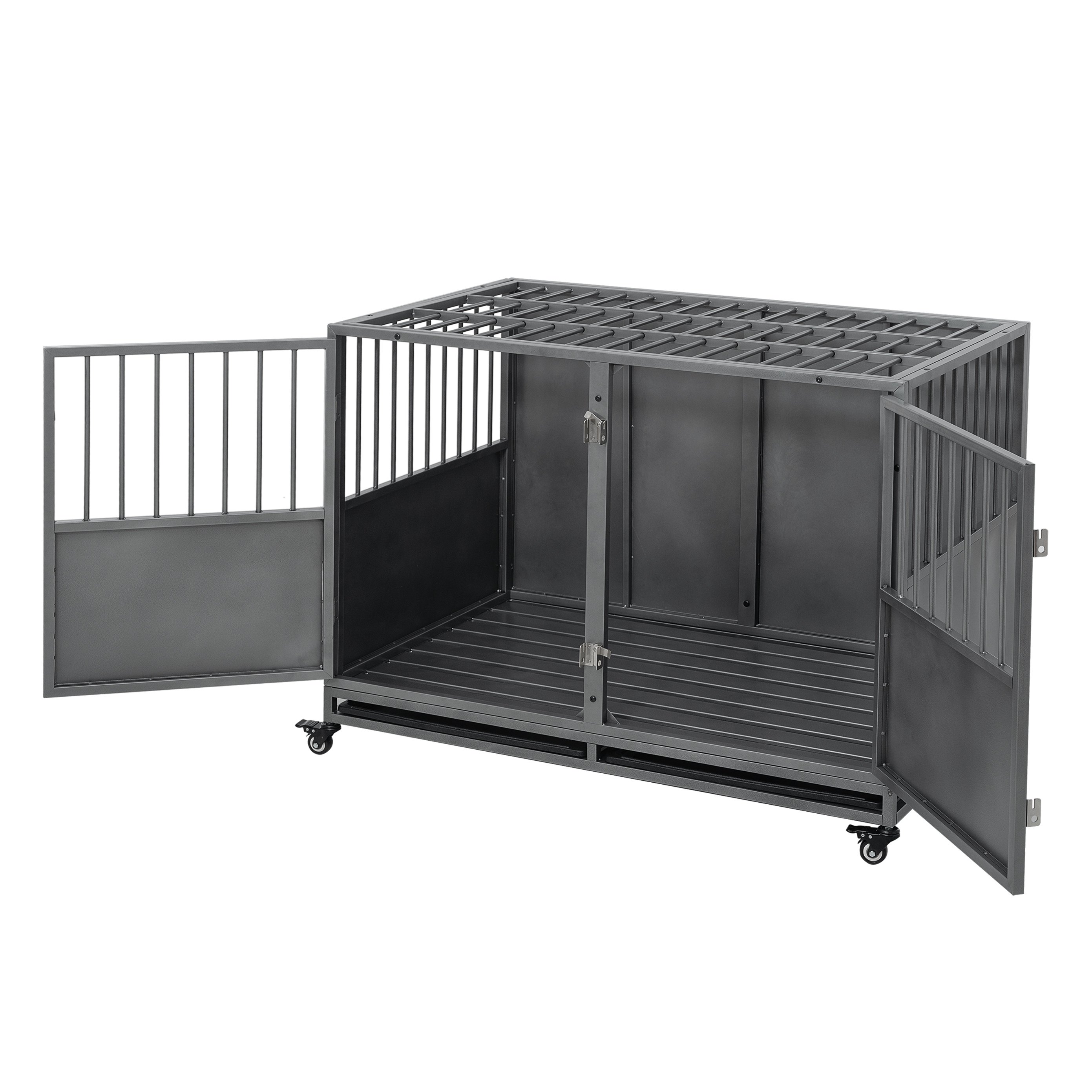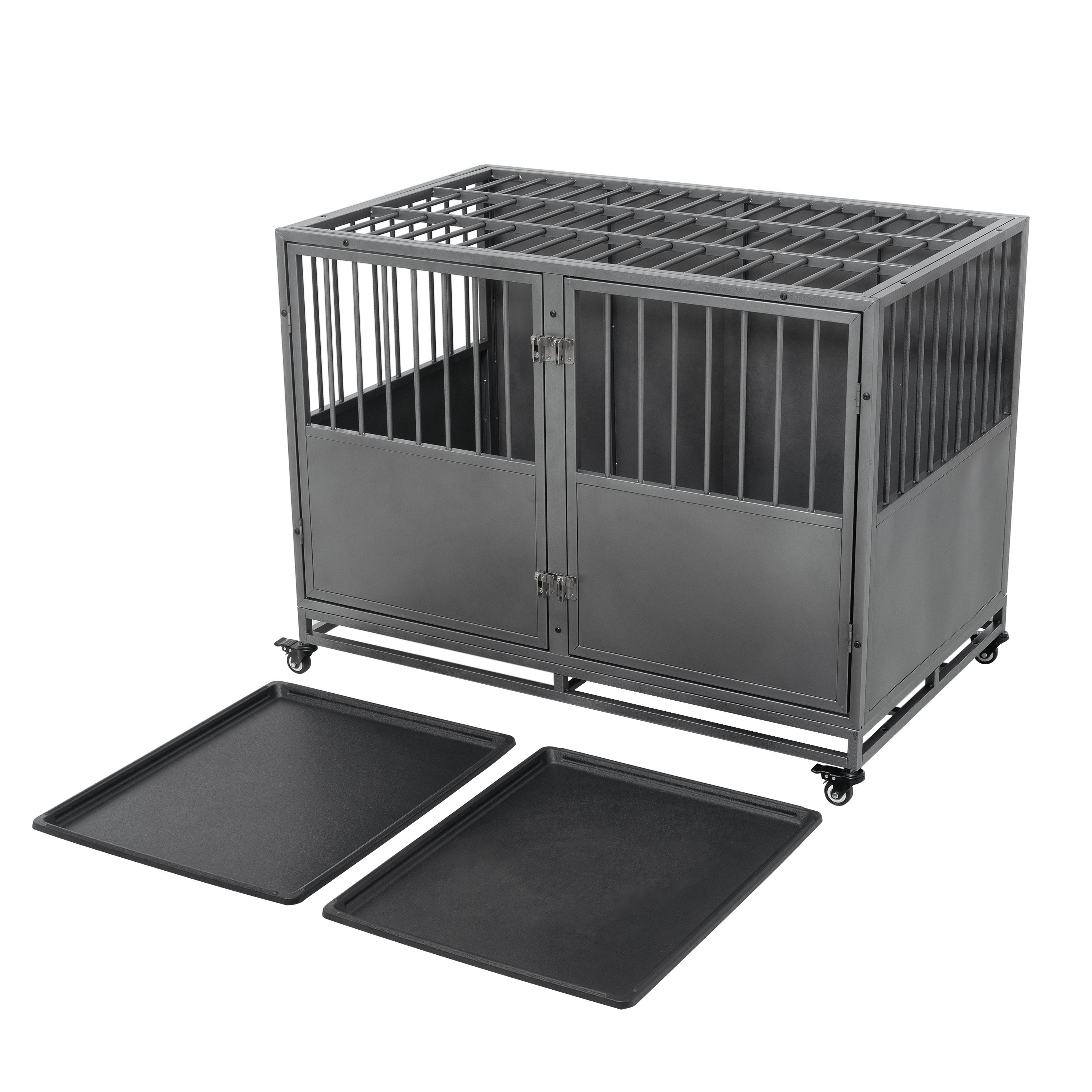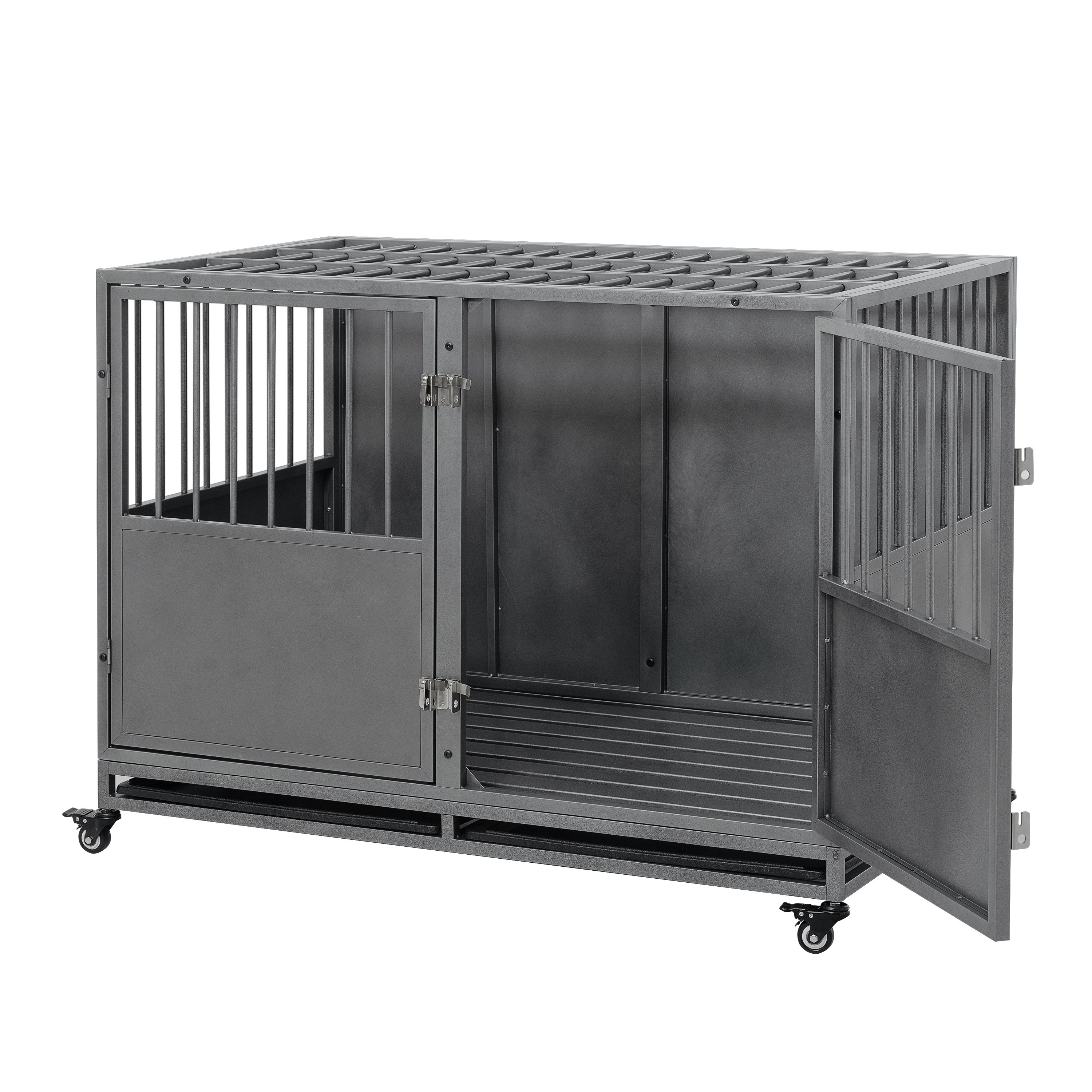 Feasures:Sturdy: Our dog crates features 10 mm diameter metal pipes that effectively prevent chewing, ensuring durability and avoiding deformation. The heavy-duty frame construction combines square tubing and metal sheet, providing your pet with a long-lasting, stable, and safe resting place. Ventilation & Privacy: The spacious interior provides maximum comfort for your beloved companion. The open metal bars allow for visibility and optimal wind flow, preventing overheating. The metal sheet helps your dog experience inner peace of mind, avoiding any feeling of confinement while enjoying a well-ventilated environment.Backside Screened: keep you pet away from the wall when you place the crate close to the wallpaper or wallboard.Double Door Style: There are two doors in front side, you can open one or both for your needs, and also you can divide the crate space when the dog is just a puppy.