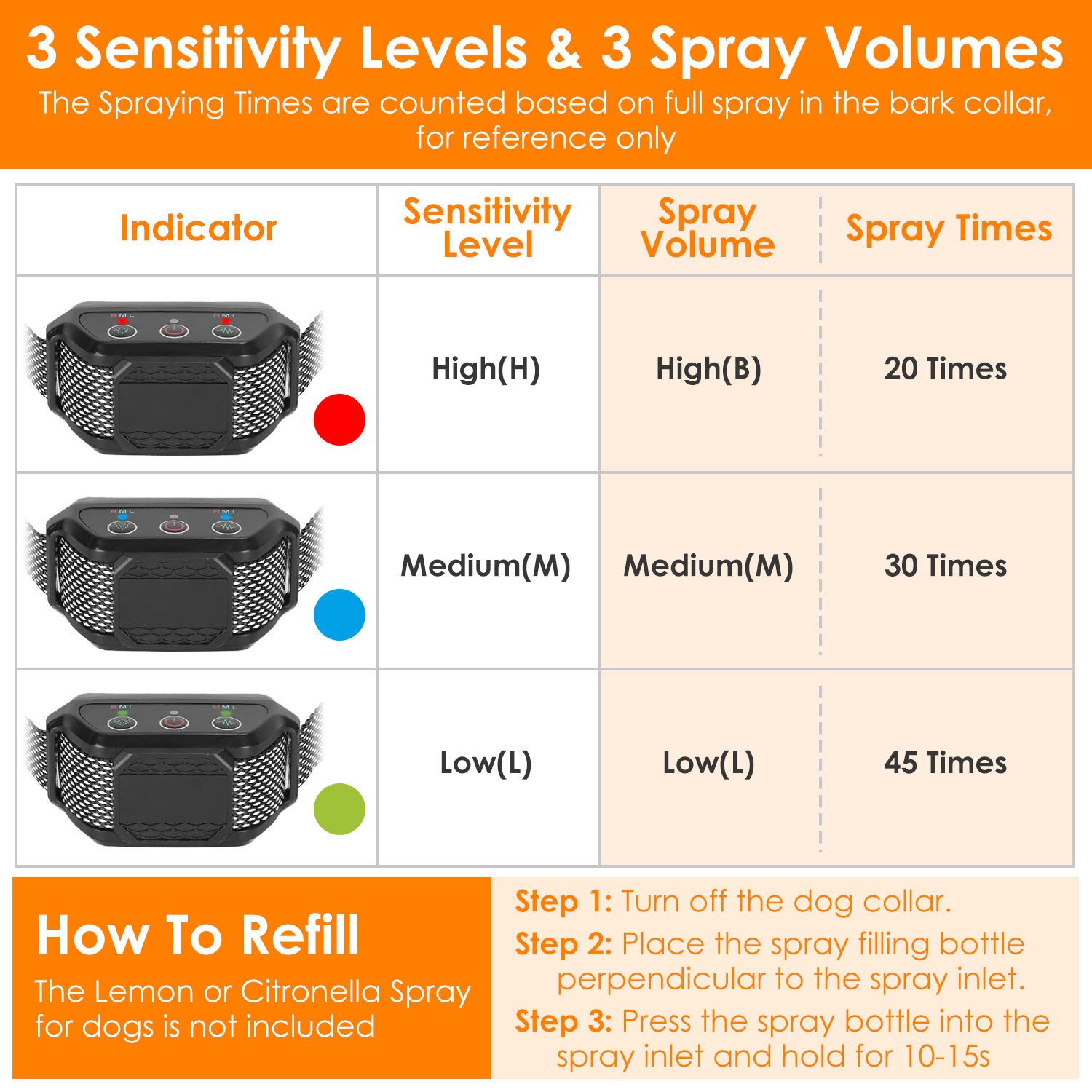*3 Sensitivity Levels & Spray Volumes*: This citronella bark collar features 3 sensitivity levels and 3 spray volumes, suitable for dogs of all sizes. You can choose the most suitable combination of sensitivity and spray volume for your furry friend.