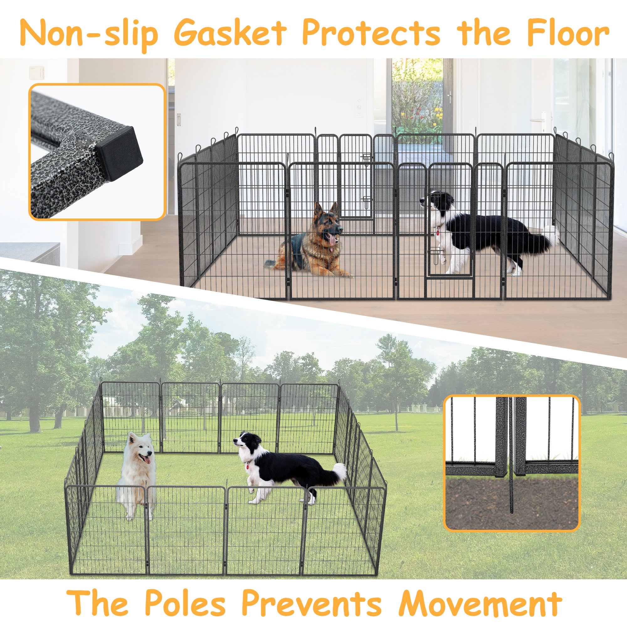 Durable & Premium Material:The dog playpen for large dogs is made of high quality wrough iron and features double-coated finish that makes it highly rust-resistant and waterproof, ideal for RV camping, traveling, or use in the yard. The dog fence with protective pads on each panel and flat stakes make it suitable to use indoor. Perfect indoor and outdoor dog play pen for resting and playing.