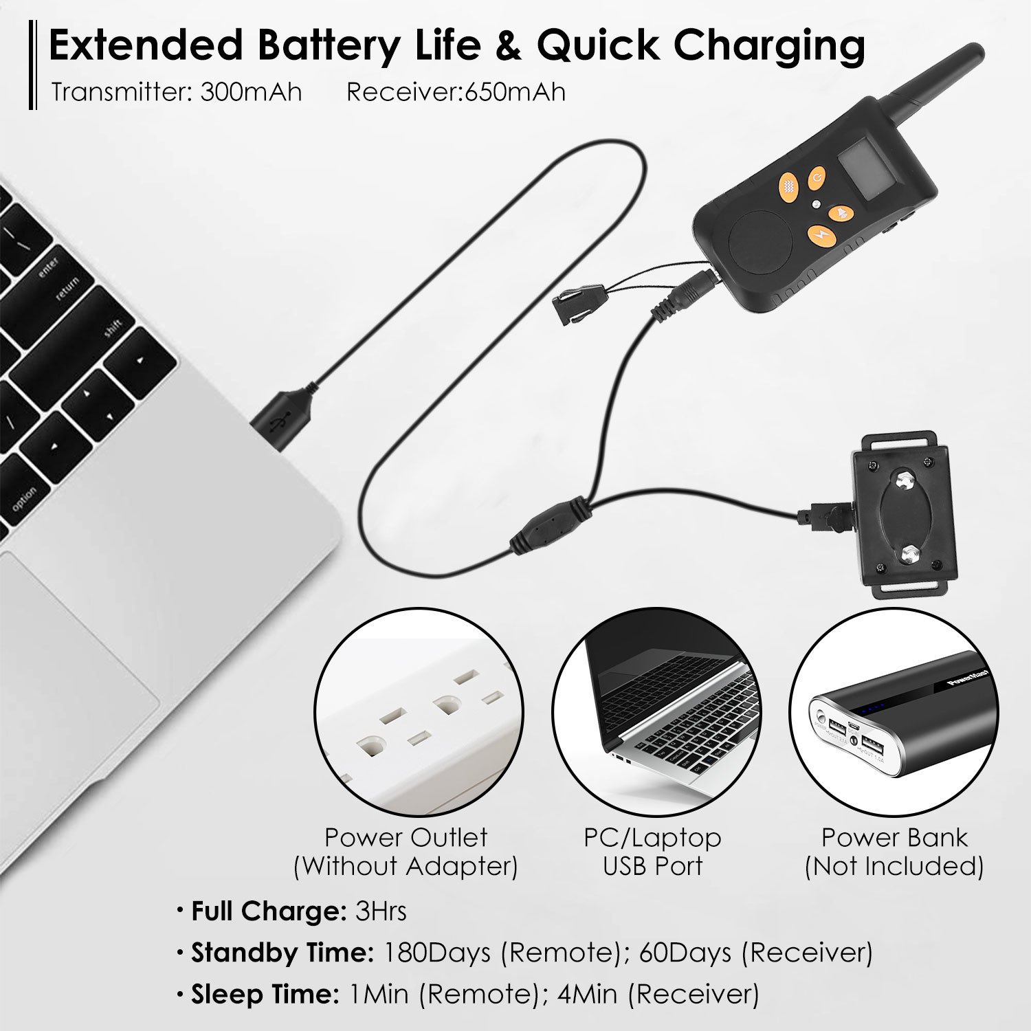 *Long Standby Time*: Our bark collar is rechargeable. About 3 hours rapid charging, standby time of receiver lasts up to 60 days while transmitter up to 180 days. Designed with USB charging port, can be conveniently charged via PC, phone charger, laptop, or power bank. Note: Adapter not included.