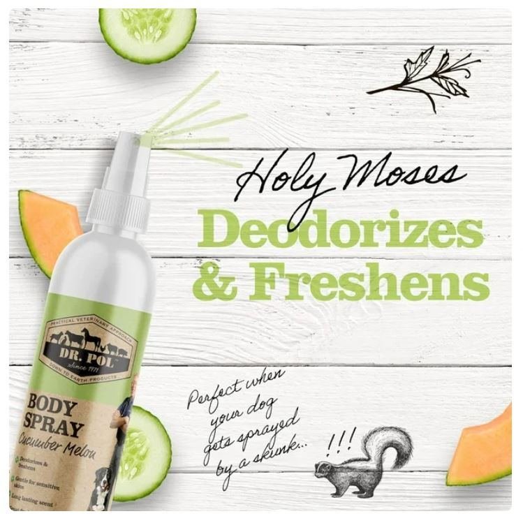 About Dr. Pol Pet Deodorant Spray for Dogs & Cats Does your pet enjoy bath time? If your answer is anything but a resounding 'yes!,' you need Dr. Pol Pet Deodorant Spray for Dogs and Cats! This pet perfume spray and fur freshener uses safe and effective ingredients to refresh the coat and eliminate odors, leaving a delightful fruity aroma in its place. Grab this scented dog spray for the summer and soak up the sun with a sweet scent for your pet, or use before meeting new humans. This dog cologne spray is fantastic for a post-dog park spray-down, or an after-swimming fur refresher. Any old cat and dog deodorant spray can help cover up odors, but this formula penetrates the fur to deeply refresh and neutralize odors. It's more than just perfume for pets; it's a deodorizer and cologne in one! This cat and dog odor spray for fur helps your furry friend stay clean and fresh between baths, so if your pet isn't a big fan of water, a quick spritz is all you need. A refreshing pet fragrance spray, this dog deodorizer is safe for pets 12 weeks and older, so you can also use this as a kitten or puppy perfume for the skittish young pet. Alternatively, this pet perfume can act as a grooming spray to add a pleasant scent after a luxurious bath, or to help refresh the coat of a senior cat who cannot effectively self-groom. For the smelly, messy, or water-avoiding pet, reach for a high-quality and effective pet perfume with wholesome, mild ingredients. Try Dr. Pol Pet Deodorizing Spray for Dogs and Cats today!
