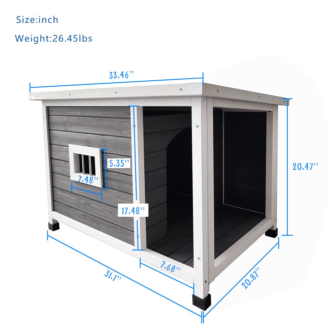 Waterproof design:Waterproof roof and plastic cover feet provide ultimate protection for long-term outdoor use.Open-up Roof: And the open-up roof provides easy access for cleaning and airing out the interior to maintain a hygienic dog houseAvoid dampness:For additional pet protection from harsh weather, the elevated from the ground provides great air circulation and a dry surface for your dog. Durable Construction:Pet house is made of solid fir wood which is strong and sturdy for long-lasting protection. You can be confident that your pet will be kept safe and comfortable in this durable shelter.Balcony: The dog house comes with a small balcony, which allows your furry baby to rest and watch the scenery here.OVERALL DIMENSION:33.46"×23.62"×22.83" inches ,Suitable for medium size dogs weighing up to 30 lbs .