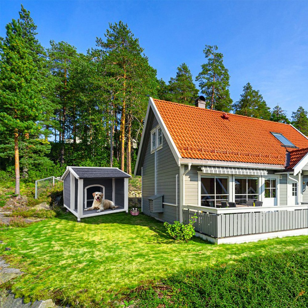 STYLE: Designed with porch and bedroom, it's perfect for most small to medium sized dogs under 40lbs. It can be used for your backyard, patio, garden or inside houseSTABLE & DURABLE: Made of solid fir wood in high stability. The dog home is secure for your lovely friends. The interior floor can be pulled out for easy cleaning. It is a safer and more comfortable pet shelter for your lovely pets.SPACIOUS PORCH: There is a spacious deck porch for dogs to lounge or take a nap in sunny dayWaterproof & Ventilation: The outdoor dog house has a 0-gaps sloping roof that effectively preventing water from seeping through and keeping dog kennel dry in rainy weather. It is also designed with raised feet and a bottom plate with gaps, which is ventilated, breathable, and moisture-proof, ensuring that the interior of the dog house is free of mold. This house provides a healthy and comfortable living space for your furry friends.RAISED DESIGN: The elevated floor keep syour pet dry and warm, while also protecting your dogs from moisture.Low Maintenance:This dog kennel requires minimal maintenance. It's easy to clean and no need to seal it regularly, allowing dirty water to flow out from the bottom simply by hosing it down. This enhances the convenience for pet owners while maintaining a sanitary living space for their pets.Easy to Assemble:Our dog house is designed with user-friendly assembly in mind. We provide a detailed installation manual, a single person can easily assemble the product within 20 minutes or less.