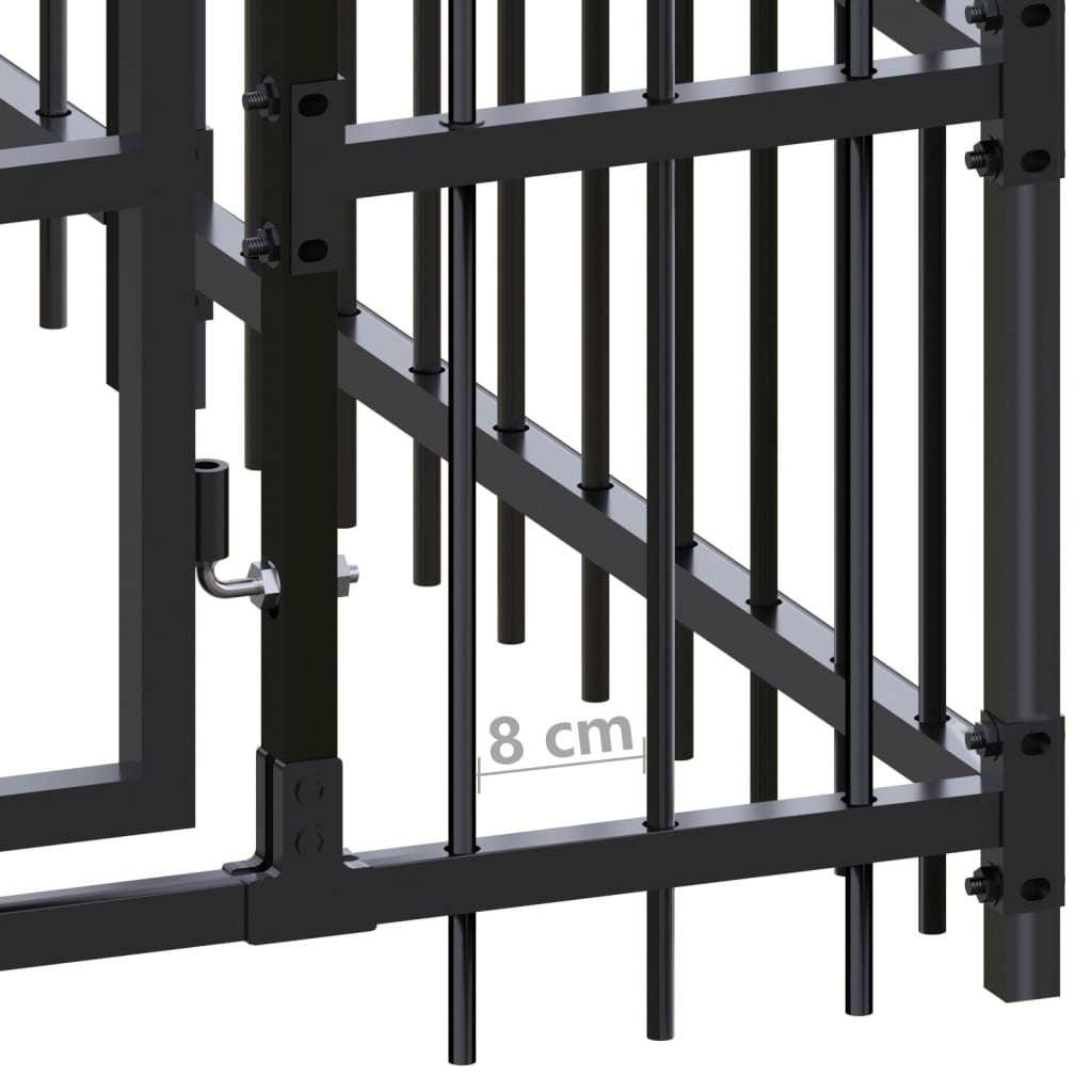 This dog kennel provides ample exercise space. The walls of steel bars help prevent mischief and unexpected accidents while enabling ventilation. Thanks to the sturdy powder-coated steel construction, this dog kennel is durable and built to last. The roof provides protection from sun, rain, snow, as well as other weather conditions. The hinged door with a lockable latch system ensures extra security and safety for your dogs.