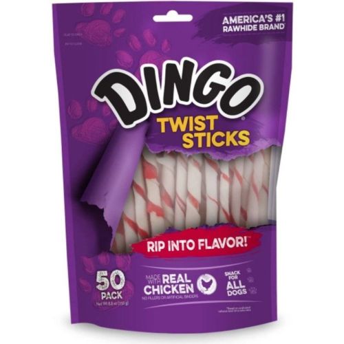Dingo Rawhide Twist Sticks bring a twist of excitement to rawhide chews that dogs cannot resist. Dingo Twists with Chicken in the Middle are made with premium rawhide and real chicken that are twisted together to form a fun, new chew that goes beyond plain old rawhide chips.