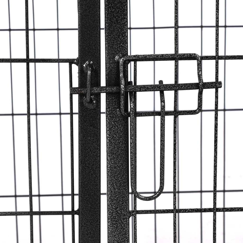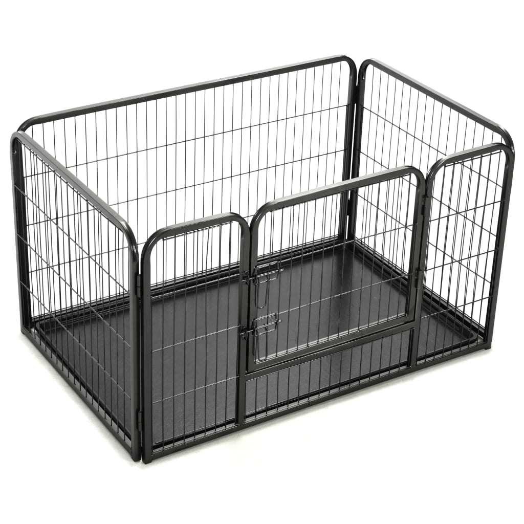 This dog playpen can be easily set up or taken down. It features a hinged door with security latches for easy access. This durable and weather-resistant playpen is made of rustproof powder-coated steel; making it suitable for outdoor and indoor use. A plastic bottom tray is also included in the delivery.
