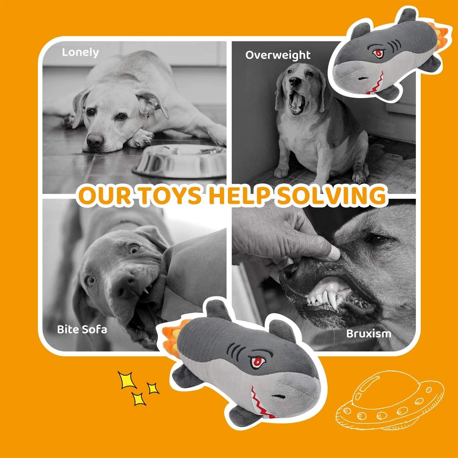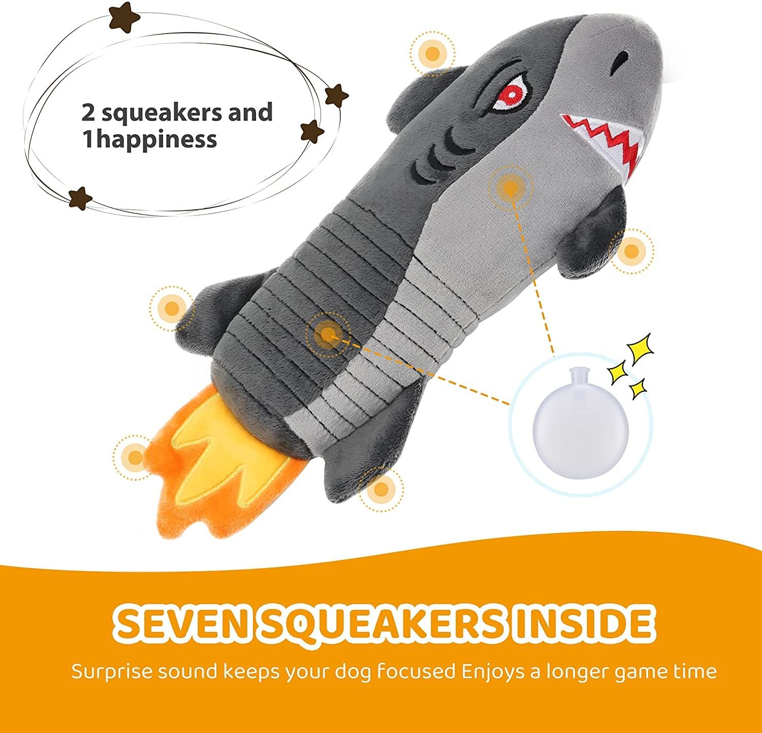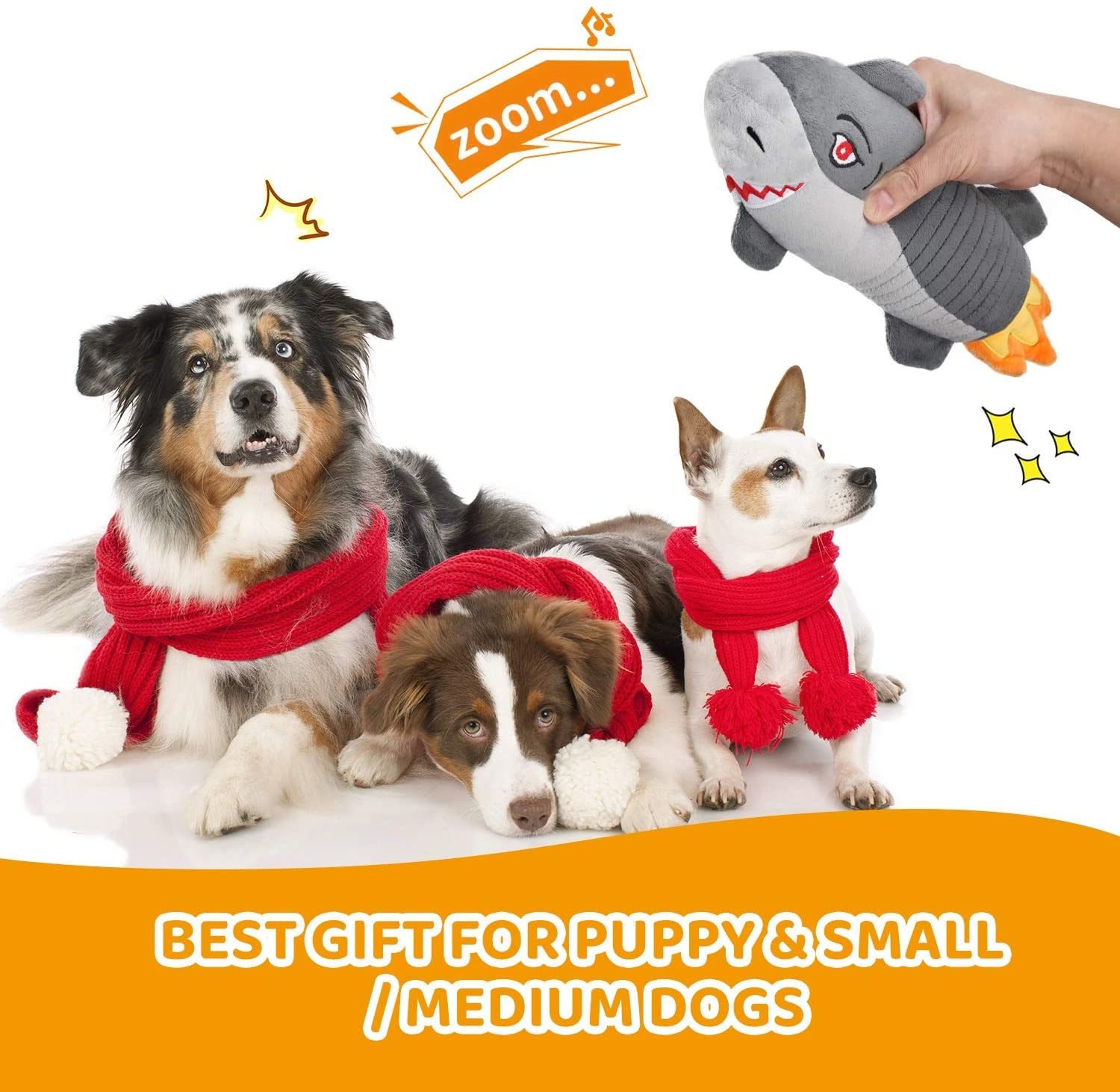 4.Best Design:Indestructible plush dog toys are our new design that combines the appearance of shark and rocket. The interesting appearance can arouse the interest of the dog. This funny cute rocket shark dog toy is the best gift for your dogs.